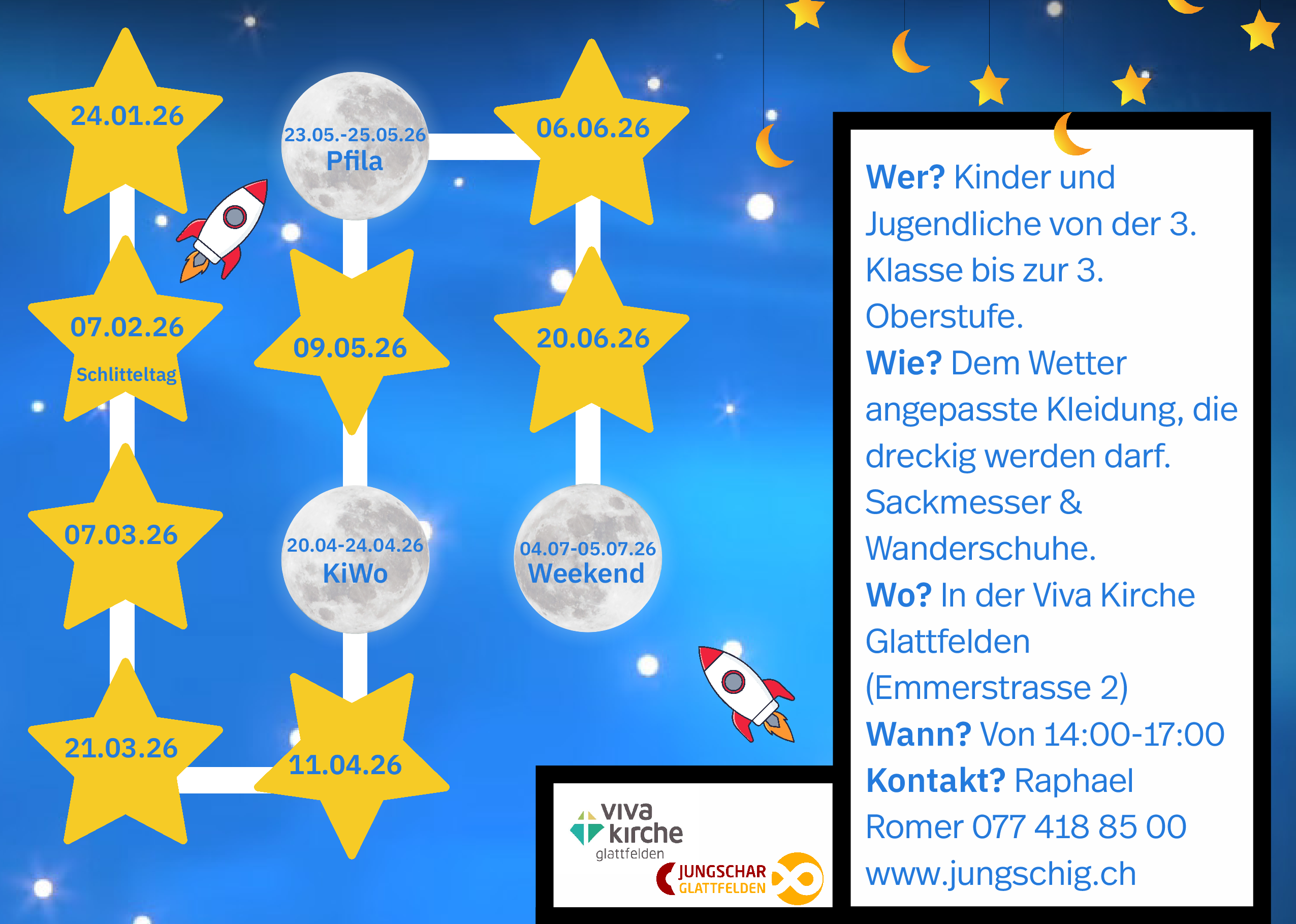 Unsere Jungschararbeit ist ein ausserschulisches Freizeitangebot der Viva Kirche Glattfelden für Kids von der dritten bis zur neunten Klasse. Wir gehören dem Verband Bund Evangelischer Schweizer Jungscharen, kurz BESJ, an.